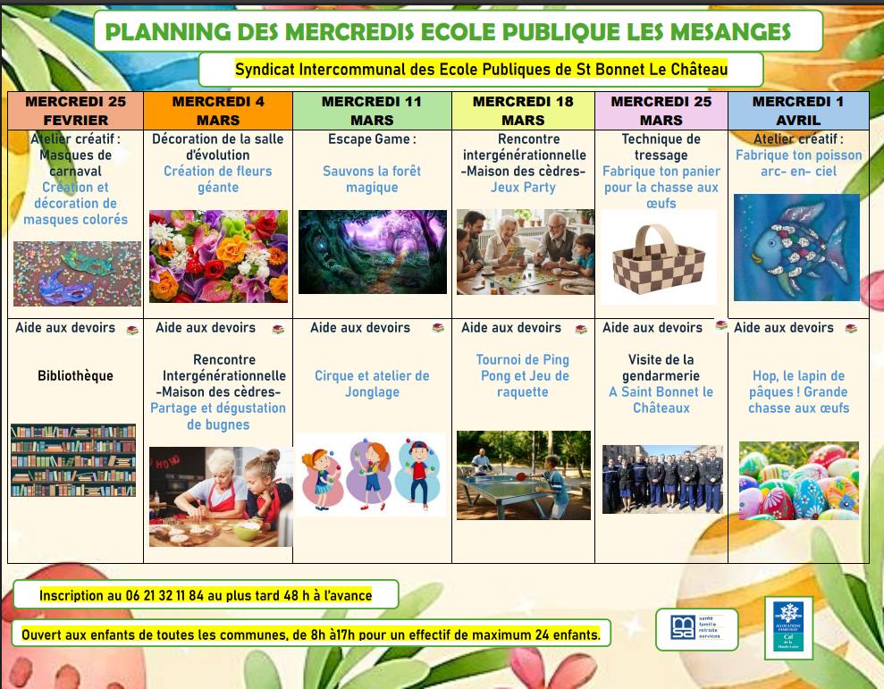 Ecole les Mésanges Planning Mercredi Mars